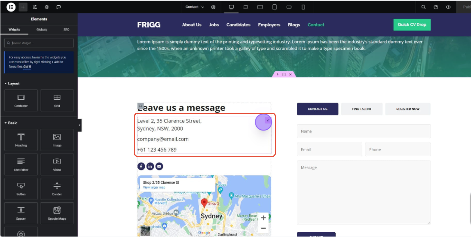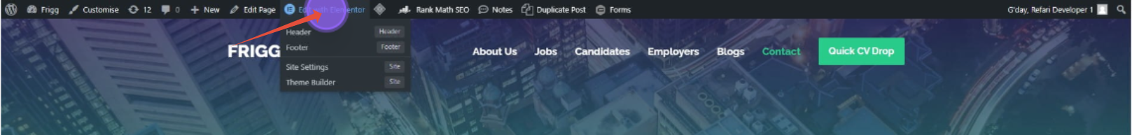 Step 6: Now repeat the process as stated above to edit a page where another address is stated. In this example we'll change the address on the contact page, hover on Wordpress Top bar and click "Edit with Elementor".